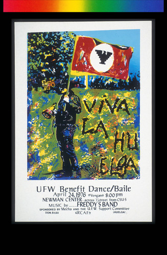 Announcement Poster for "UFW Benefit Dance/Baile." A man is holding a megaphone in his right hand and the farm workers' flag with the black Aztec eagle in his left hand. On a blue-green landscape, black lettering reads: "Viva la huelga" and "Boycott Gallo c/s".