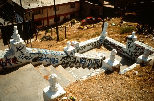 "Stairway of the Ancients" is a complex stairway, probably built in the 1920s, leading up to the Casa de la Cultura. It is in disrepair with parts that are eroded or broken. To try to keep within this context, the figurines that MacConnel has cast, purchased from street vendors, are irregular, broken and "antiqued." The "Ancients" are funny, sad, prideful, odd remnants of tourist art.